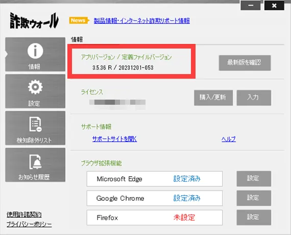 - 定義ファイルの更新(ヒューリスティック検知機能における詐欺・危険サイトの最新定義が適用できず、検知精度が低下する可能性があります。)