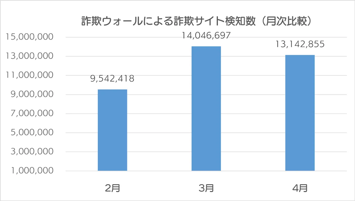 2025年4月の詐欺ウォールによる詐欺サイト検知数は13,142,855件でした。2025年3月と比較すると、903,842件減少する結果となりました※。