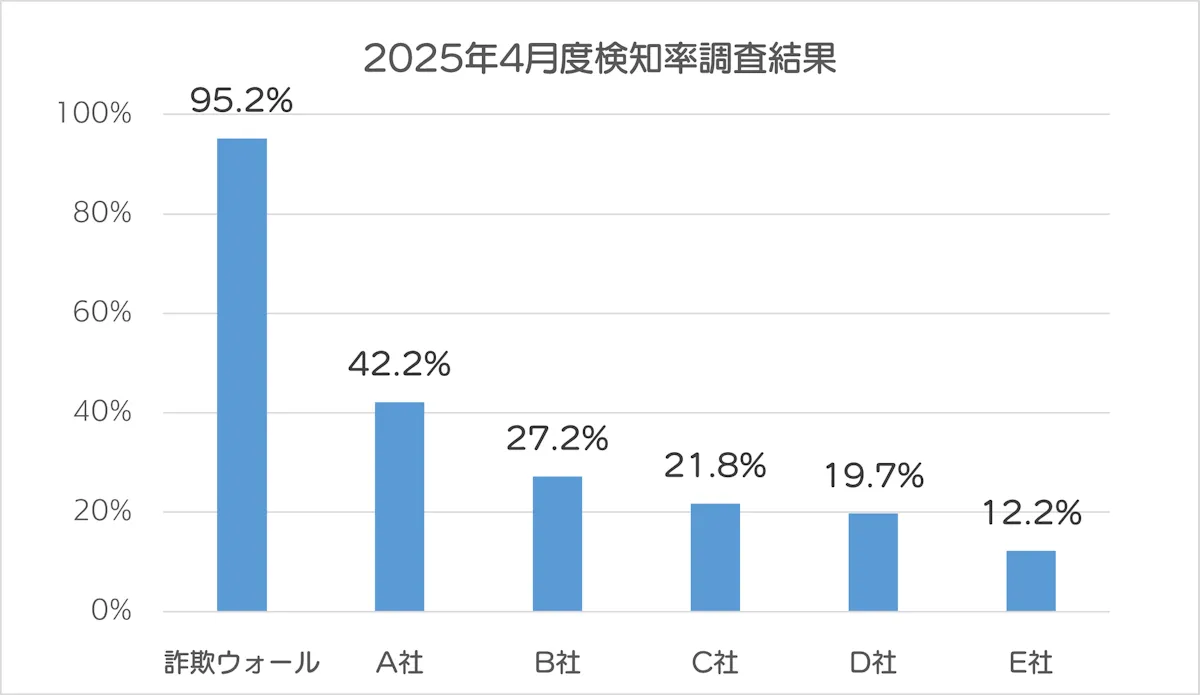 詐欺ウォールを開発・提供するBBSSでは、公的機関などとの連携によって収集した詐欺サイトURLを利用し、定期的に詐欺サイトの検知率調査を行っています。2025年4月の詐欺ウォールによる詐欺サイト検知率は95.2%と、アンチウイルス機能を搭載したセキュリティ製品各社と比較し高い結果となりました。