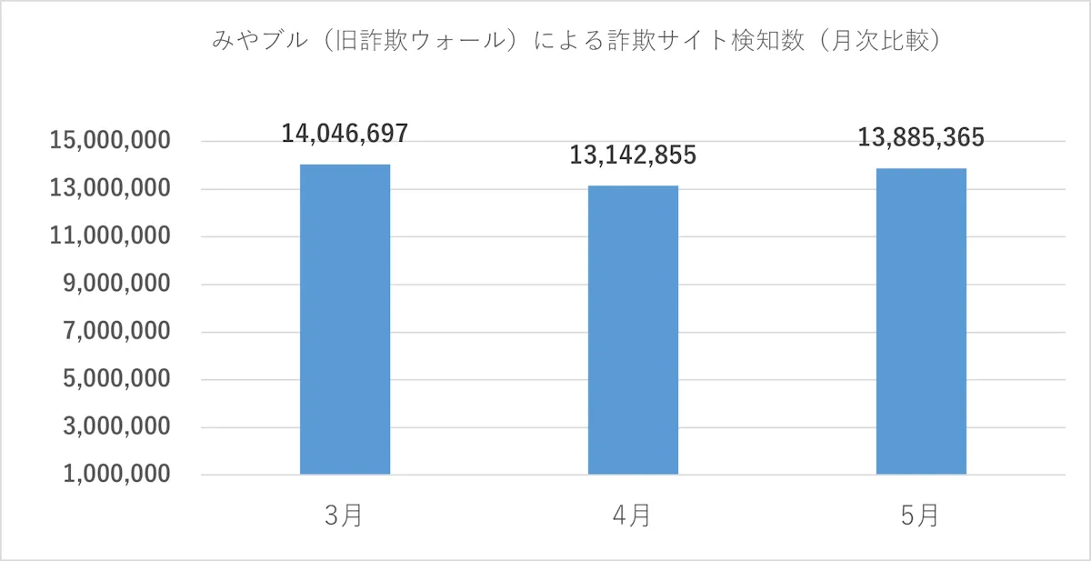2025年5月のみやブル(旧詐欺ウォール)による詐欺サイト検知数は13,885,365件です。2025年4月と比較すると、742,510件増加しました※。