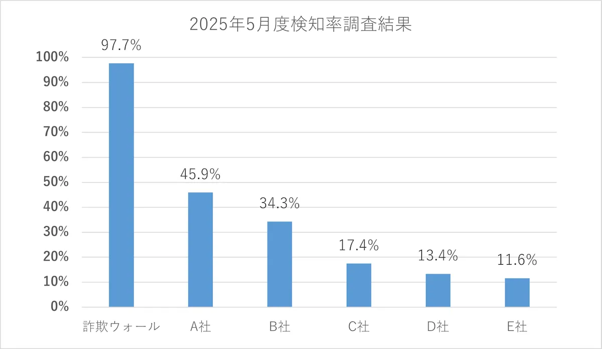 みやブル(旧詐欺ウォール)を開発・提供するBBSSでは、公的機関などとの連携によって収集した詐欺サイトURLを利用し、定期的に詐欺サイトの検知率調査を実施しています。2025年5月の詐欺ウォールによる詐欺サイト検知率は97.7%とアンチウイルス機能を搭載したセキュリティ製品各社と比較し高い結果となりました。
