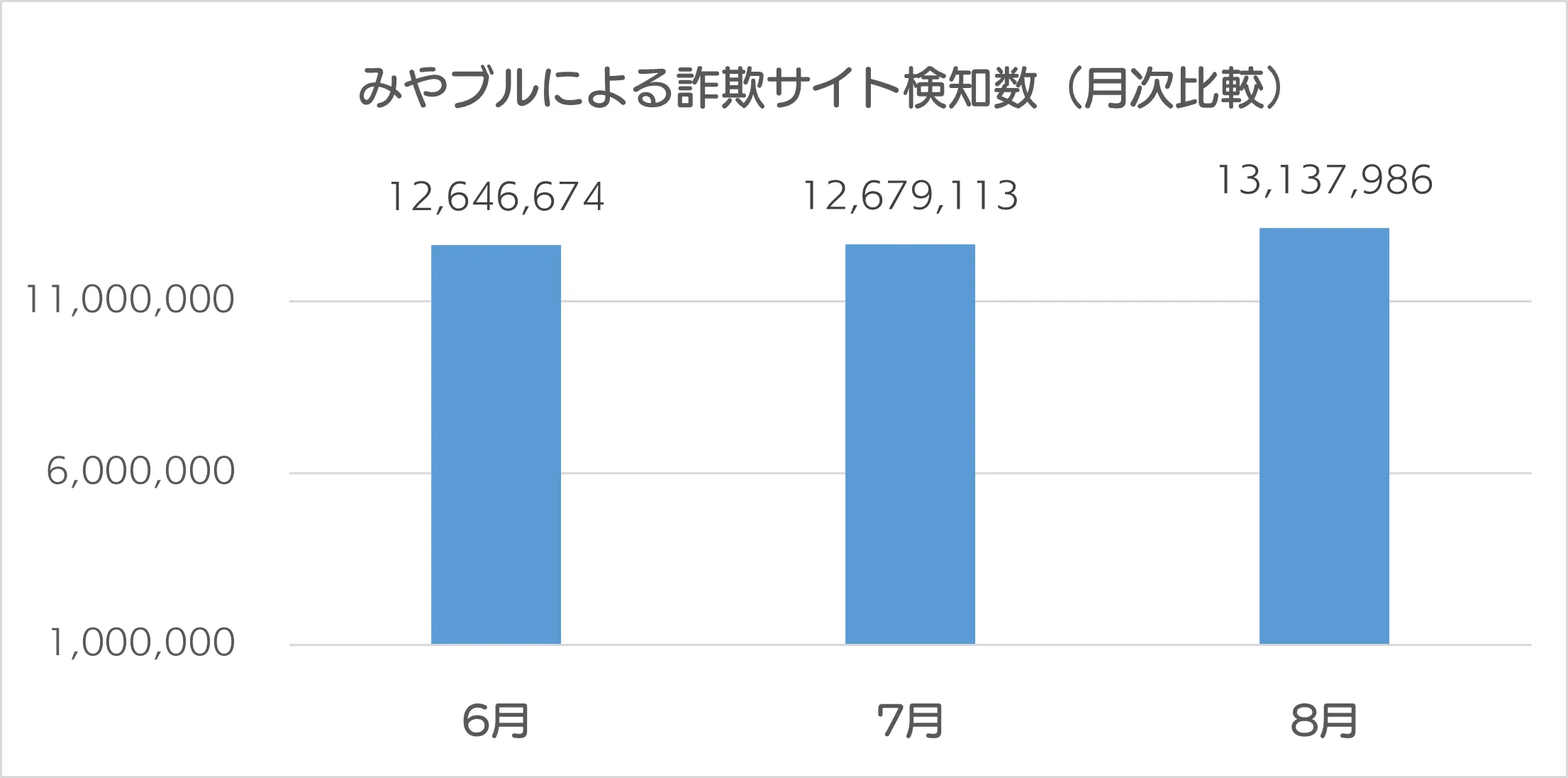 2025年8月のみやブルによる詐欺サイト検知数は13,137,986件です。2025年7月と比較すると、458,873件増加する結果となりました※。
