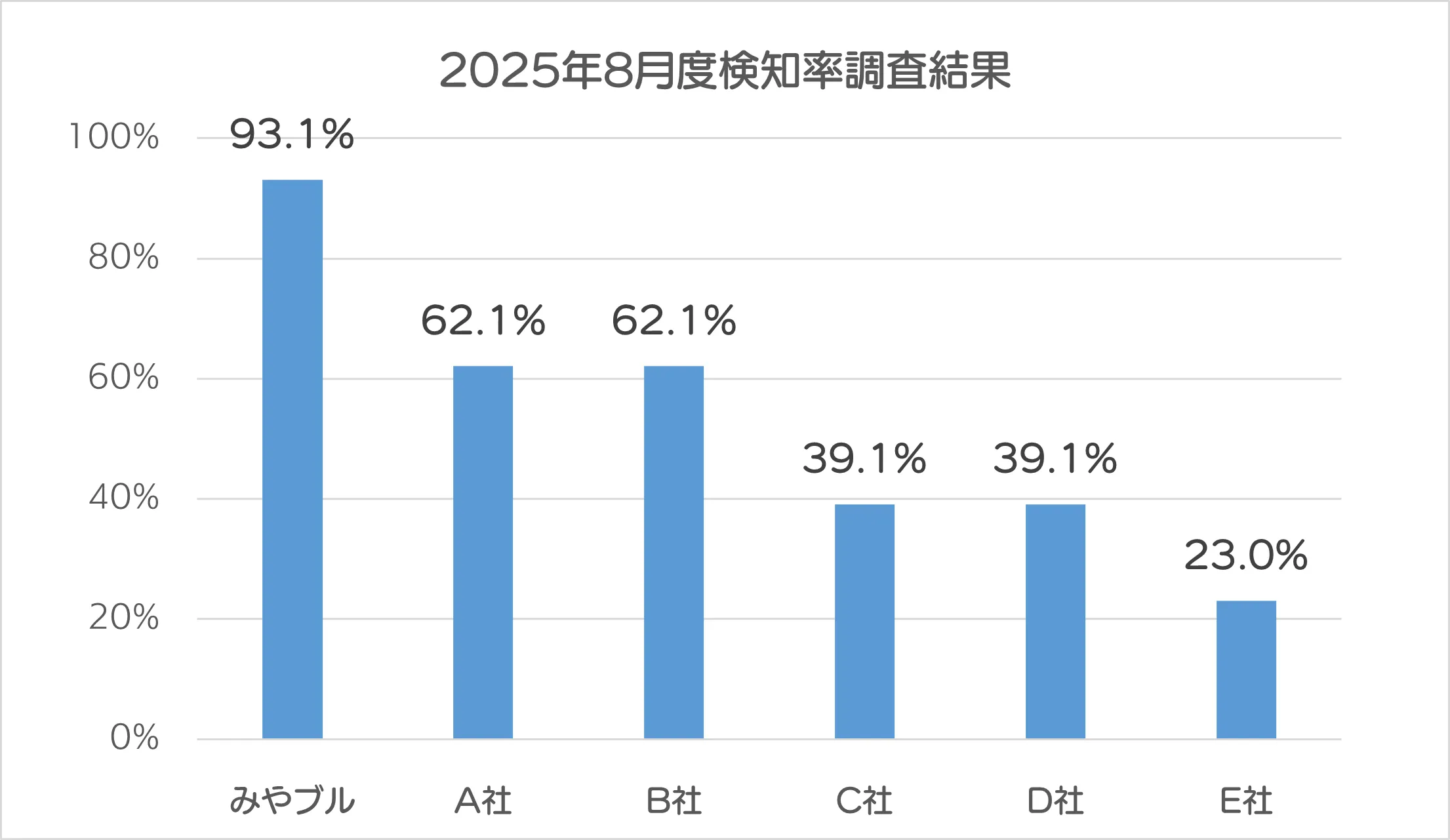 みやブル(旧詐欺ウォール)を開発・提供するBBSSでは、公的機関などとの連携によって収集した詐欺サイトURLを利用し、定期的に詐欺サイトの検知率調査を実施しています。2025年8月のみやブルによる詐欺サイト検知率は93.1%とアンチウイルス機能を搭載したセキュリティ製品各社と比較し高い結果となりました。
