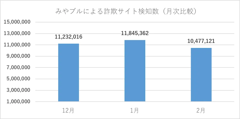2026年2月のみやブルによる詐欺サイト検知数は10,477,121件で、2026年1月と比較すると、1,368,241件減少する結果となりました。