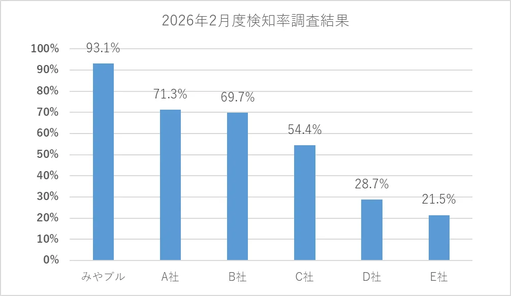 2026年2月のみやブルによる詐欺サイト検知率は93.1%とアンチウイルス機能を搭載したセキュリティ製品各社と比較し高い結果となりました。