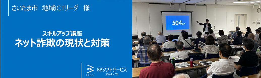 BBソフトサービス株式会社(本社:東京都港区、代表取締役社長:本多 晋弥、以下BBSS)は、2024年7月26日、与野本町コミュニティセンターにて地域ICTリーダ向けに開催された「地域ICTリーダスキルアップ講座」の「キャッシュレス決済に関するスキルアップ講座」にて、「ネット詐欺の現状と対策」と題した講座(以下、本講座)を行いました。