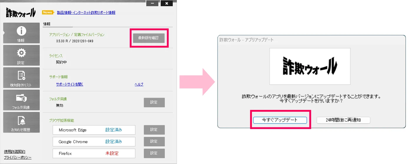 - 定義ファイルの更新(ヒューリスティック検知機能における詐欺・危険サイトの最新定義が適用できず、検知精度が低下する可能性があります。)