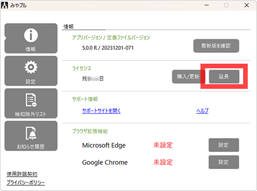 みやブル(旧 詐欺ウォール)のダッシュボード内[延長]ボタンをクリックするとライセンス入力画面が表示されますので手順 [ 1 ] で確認した「ライセンス番号」を入力します。