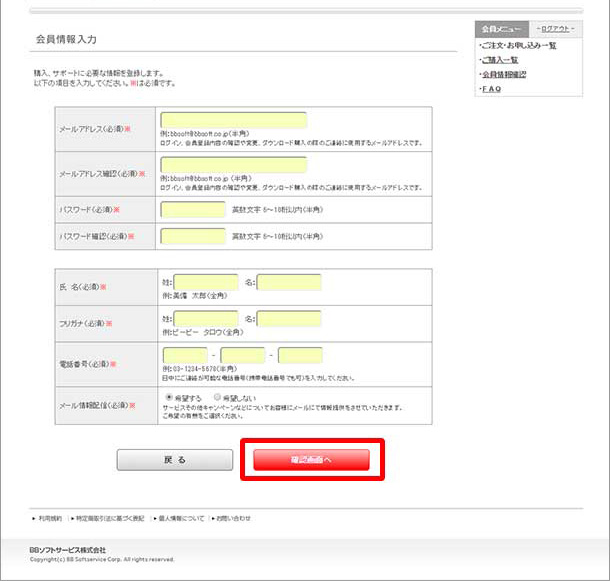 各項目に情報を入力し、[確認画面へ]をクリックします。