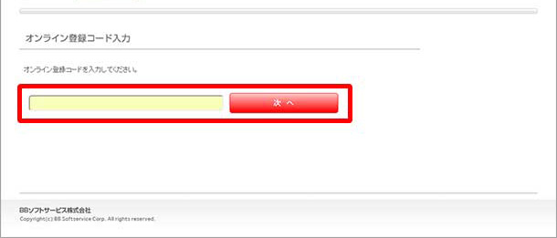 以下の画面で、「ライセンスシート」に記載されている[オンライン登録コード]を入力し、[次へ]をクリックしてください。