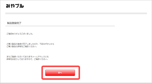 製品登録完了画面が表示されますので[次へ]をクリックしてください。