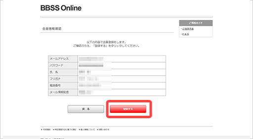 会員登録情報が表示されますので、内容ご確認いただき問題がなければ[登録する]をクリックします。