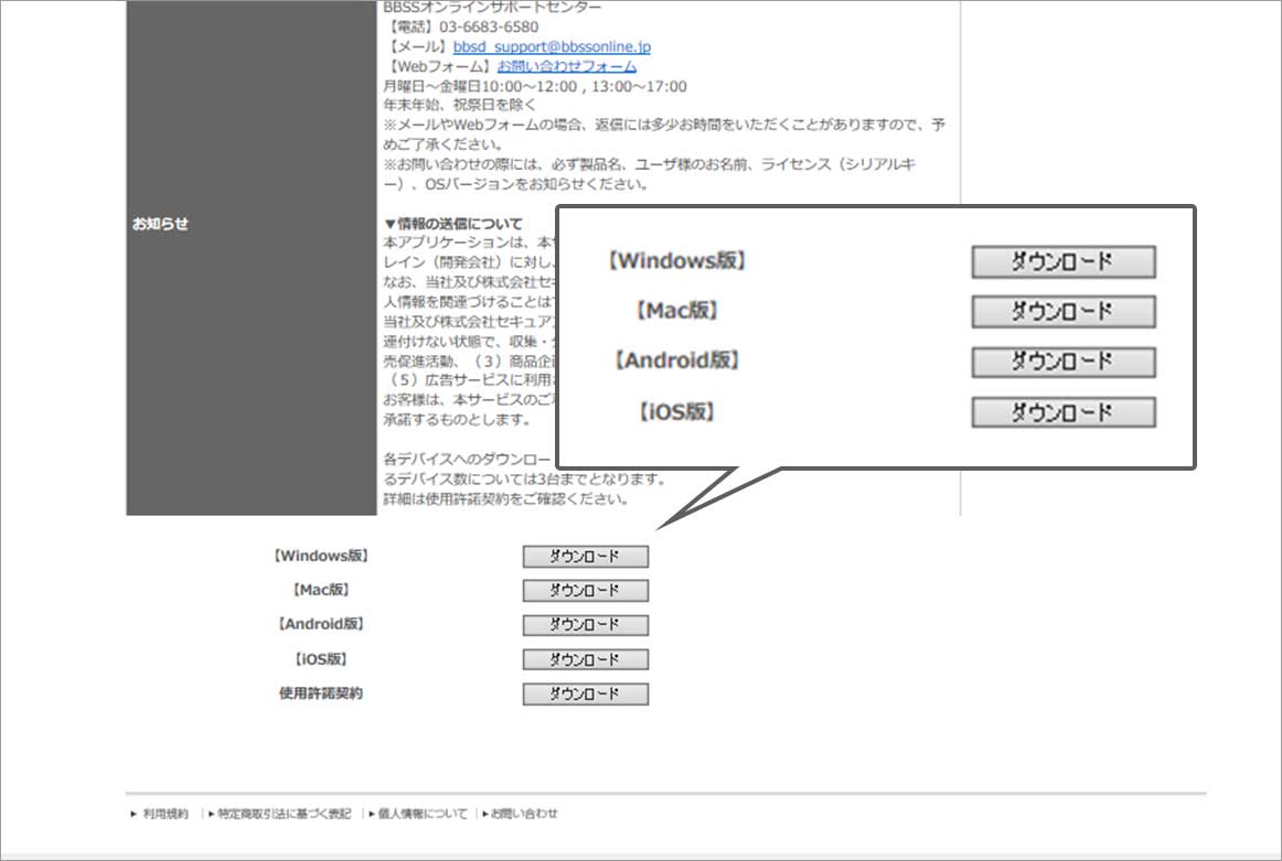 画面一番下までスクロールし、ご利用になるOSのダウンロードボタンをクリックします。
