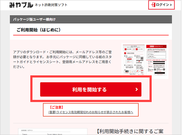 アプリのダウンロード・ご利用開始には、メールアドレス等のご登録が必要となります。 お手元にパッケージに同梱している紙のスタートガイドとライセンスシート、登録用メールアドレスをご用意ください。