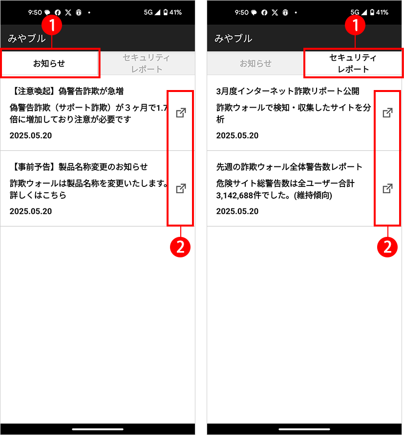 お知らせ通知、セキュリティレポートにURL設定がある場合、表示されます。