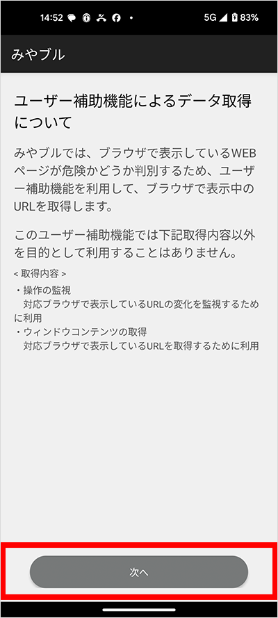 本アプリでは、ブラウザで表示しているWebページが危険なサイトであることを判別するために「ユーザー補助機能」を利用してブラウザで表示中のURLを取得します。