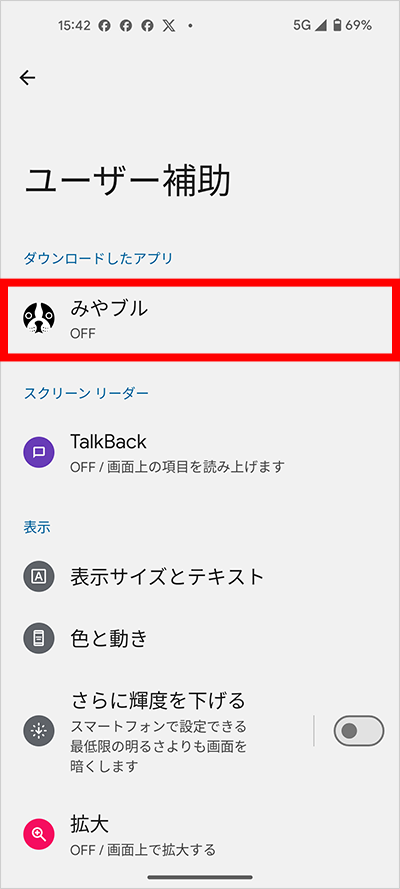 端末内ユーザー補助設定画面