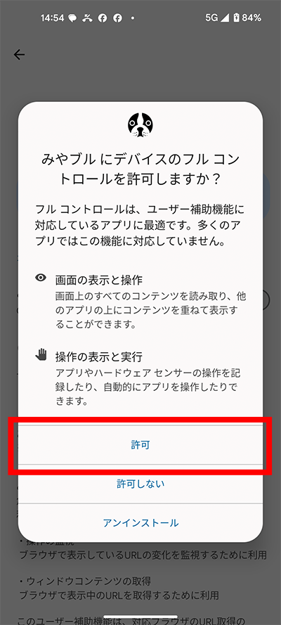 ユーザー補助機能許可設定画面
