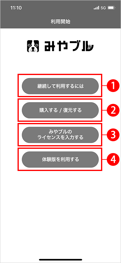みやブルを利用するためのApp内課金、ならびに購入情報の復元を行うことができます。