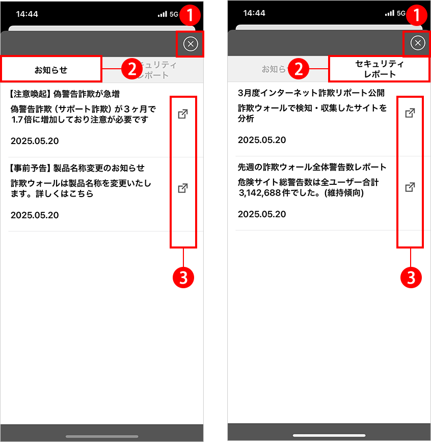 お知らせ通知、セキュリティレポートにURL設定がある場合、表示されます。