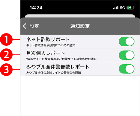 オンにするとみやブル全体の危険サイト警告数についての通知が表示され、オフにすると通知は表示されません。