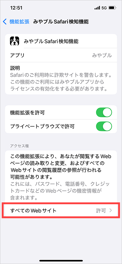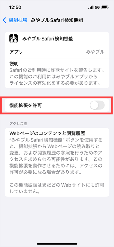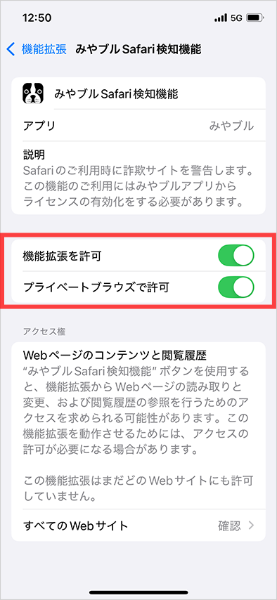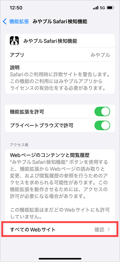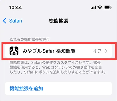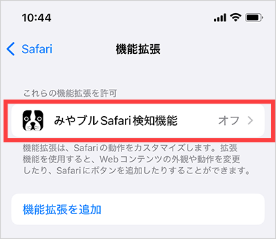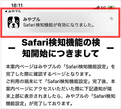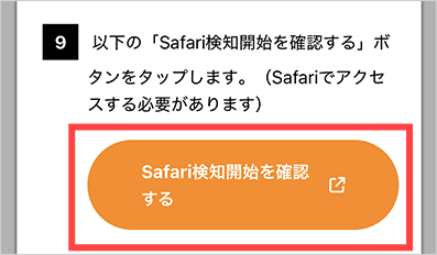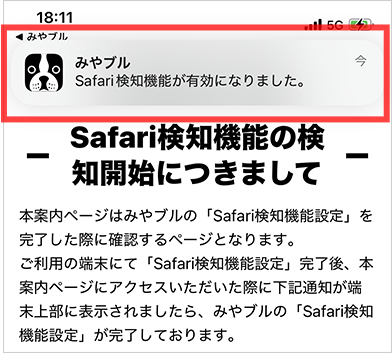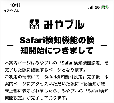 8.設定を閉じて、「みやブル」アプリを起動し、「Safari検知機能の設定手順」ページの最後に記載されている「Safari検知開始を確認する」ボタンをタップします。(Safariでアクセスする必要があります)