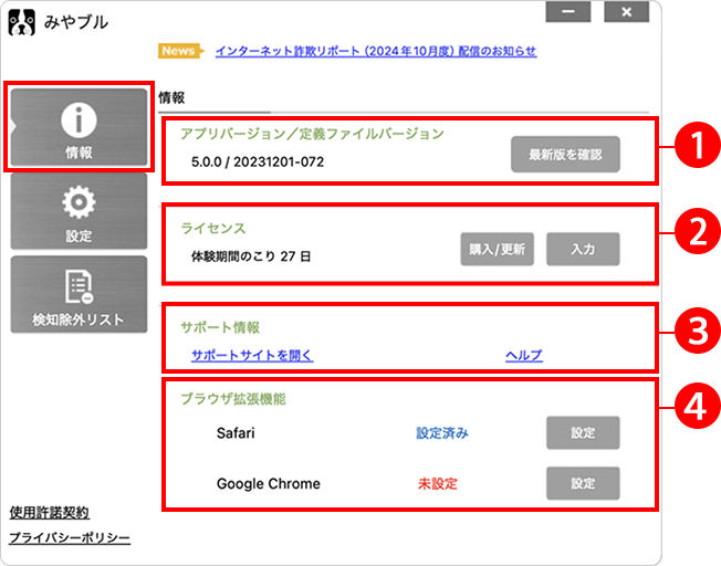 みやブルのアプリバージョンおよび定義ファイルの更新バージョンが表示されます。
