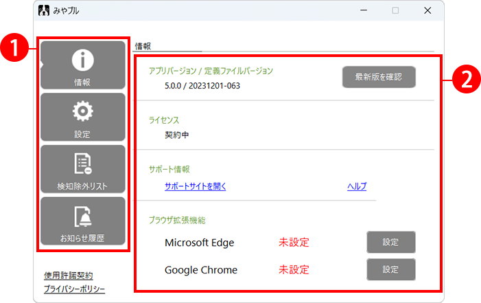 情報、設定、検知除外リスト、お知らせ履歴の中から利用する機能を選択します。